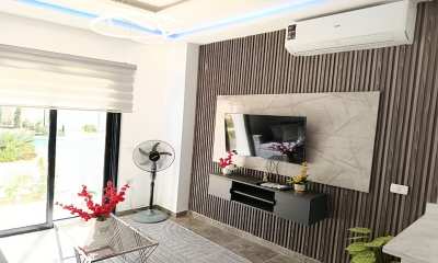 From the living room, you can step out onto a terrace with a beautiful pool view — perfect for relaxing outdoors.