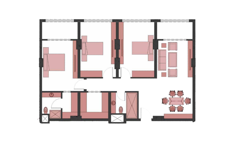 • Layout: 3 Bedrooms • 2 Bathrooms • Living area • Kitchen