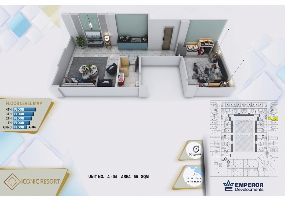 Iconic Resort Hurghada – Apartment A04, one-bedroom 56 sqm with street and mountain views.